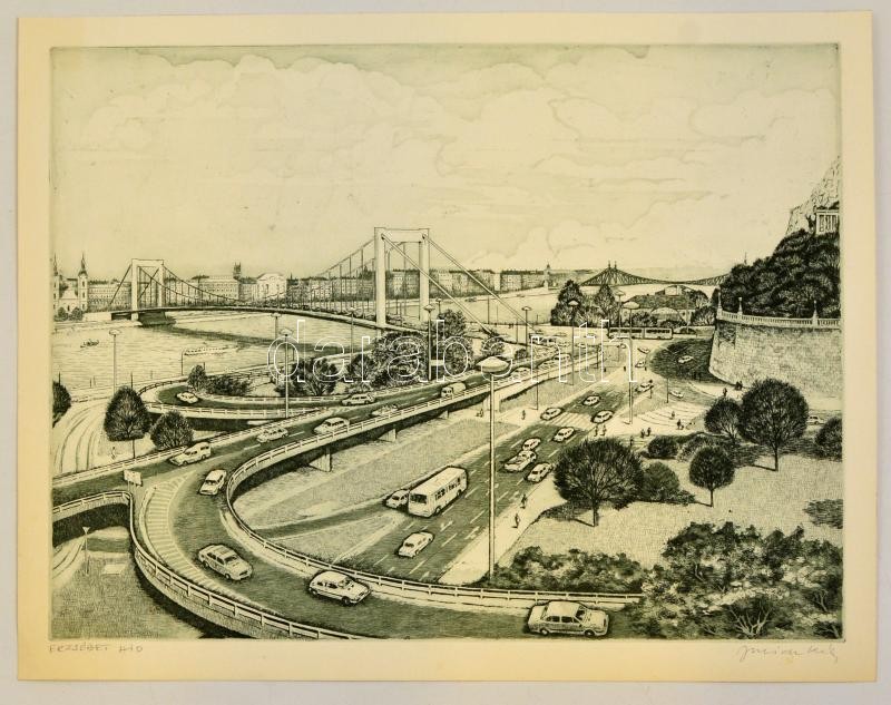 Jurida Károly (1935-2009): Erzsébet-híd. Rézkarc, papír, jelzett, 29×3...