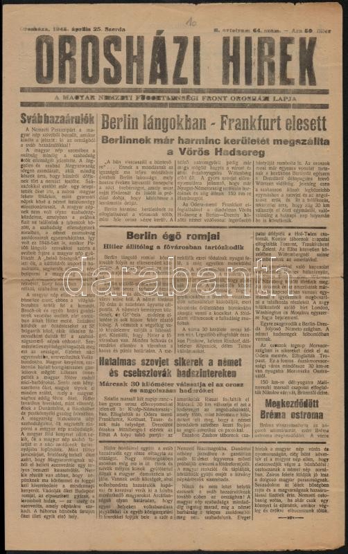 1945 az Orosházi hírek, a Magyar Nemzeti Függetlenségi Front orosházi ... https://www.darabanth.com/en/332-Online-auction/332.0/Other-collectibles/Printed-Materials~500030/1945-az-Oroshazi-hirek-a-Magyar-Nemzeti-Fuggetlensegi-Front-oroshazi-lapja-2-evf-64-lapszC3~II1828535