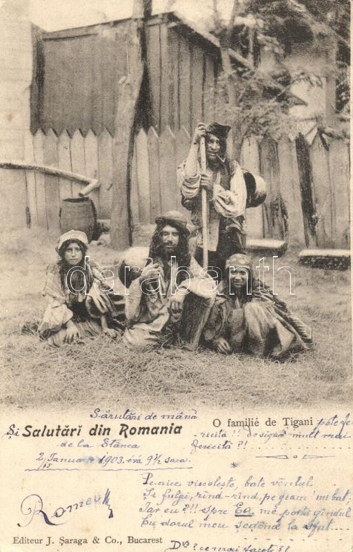 1903 Salutari din Romania, O familié de Tigani / Román folklór, cigány család. J. Saraga & Co. / Gypsy folklore from Romania, gypsy family (EK)