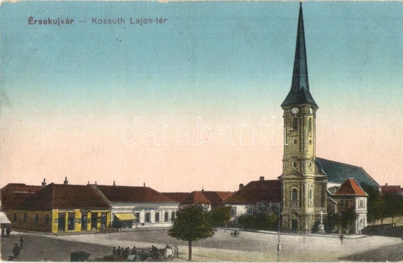 Érsekújvár, Nové Zamky; Kossuth Lajos tér, gyógyszertár, Conlegner J és fia üzlete, templom / square, pharmacy, shop, church
