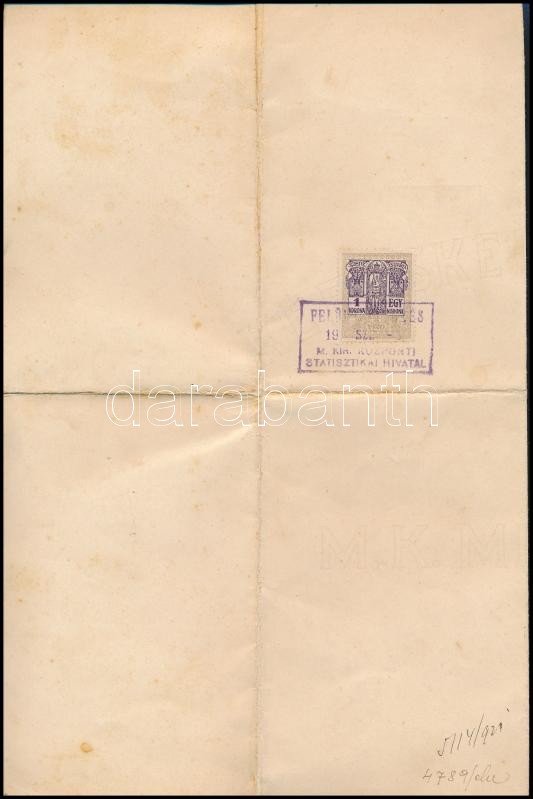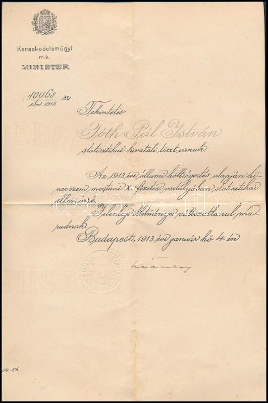 Description: 1913 Beöthy László (1860-1943) kereskedelemügyi miniszter aláírása Tóth Pál István statisztikai hivatali tiszt statisztikai ellenőri kinevezése, fejléces papír, szárazbélyegzővel, 1 k. okmánybélyeggel