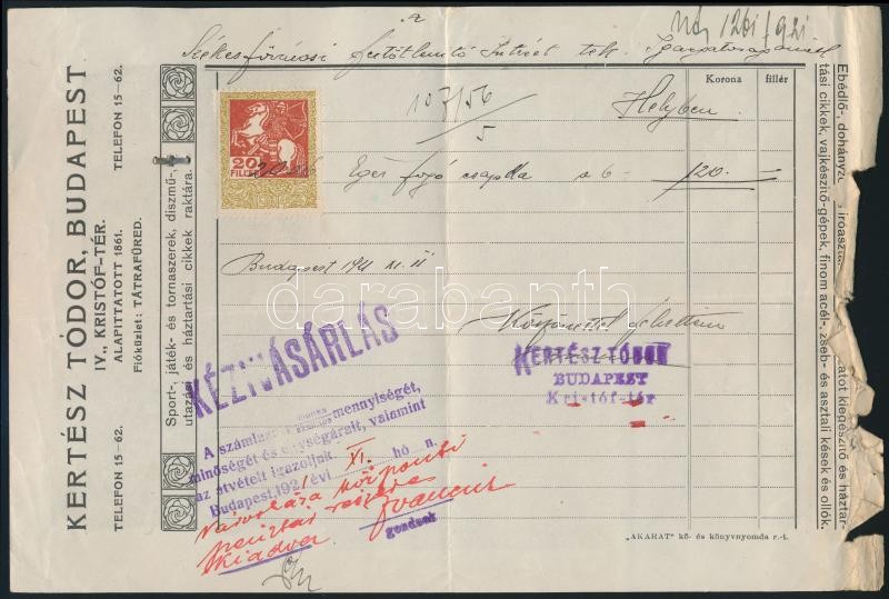 1921 Bp.,Kertész Tódor műiparárú raktárának fejléces számlája, a hátol... https://www.darabanth.com/en/333-Online-auction/333.0/Art-and-other-collectibles/Documents~500019/1921-Bp-Kertesz-Todor-muipararu-raktaranak-fejleces-szamlaja-a-hatoldalan-diszes-illu~II1869693
