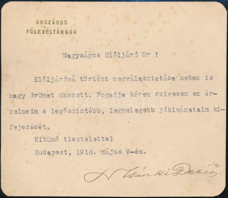 1918 Csánki Dezső (1857-1933) főlevéltárnok, történész, művelődéspolitikus, MTA tag gépelt gratuláló sorai Badál Ede I. kerületi elöljáróvá választásához, Országos Főlevéltárnok fejléces papírján, Csánki Dezső aláírásával, foltos.