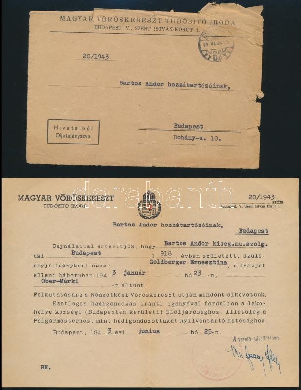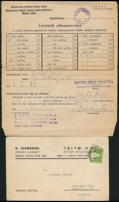 1938-1943 Bartos Andor (1918-1943) munkaszolgálatos papírjai, közte a Hadviseltek Bizottságának értesítése a munkaszolgálatos részére feladott csomagról, valamint a Magyarországi Izraeliták Országos Irodája-Magyarországi Autonom Orthodox Izraelita Hitfelekezet központi irodája átvételi elismervénye elküldött csomagról, valamint a Magyar Vöröskereszt értesítése a munkaszolgálatos Bartos Andor fronton történő eltűnéséről, valamint bizonyítvány Bartos Henriette és Adrienn részére a református hitre való áttérésről, Tel-Aviv, H. Schrenzel Orient Agency német nyelvű levele Jenoene Bartos (Bartos Jenőné?) részére.