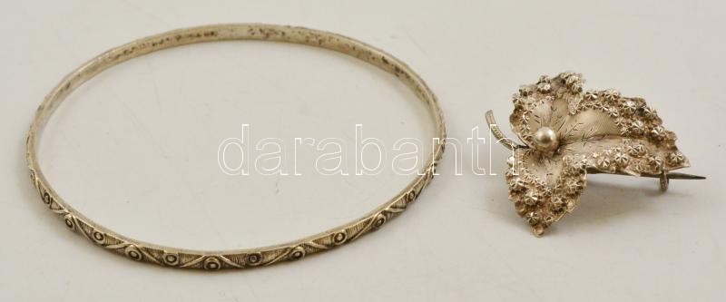 Ezüst (Ag) karperec, és ezüst (Ag.) díszes levél alakú kitűző, d: 7 cm, 3x3 cm, bruttó: 11.5 g