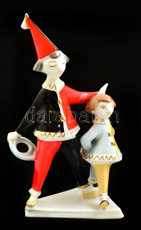 Hollóházi porcelán bohóc kislánnyal, kézzel festett, jelzett, hibátlan, m: 21,5 cm