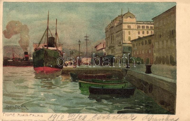 1910 Fiume, Adria Palais / Adria palota, rakpart, gőzhajó, vagonok / palace, quay, steamships, wagons. Ottmar Zieher Künstlerpostkarte No. 1775. s: Raoul Frank (EK)