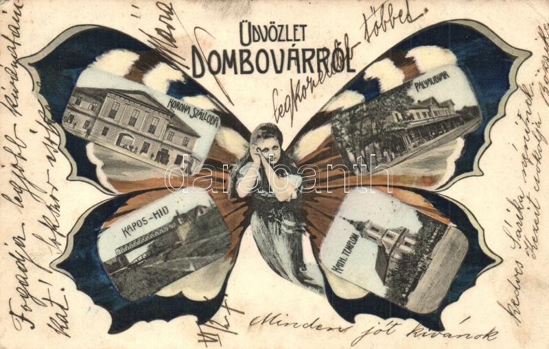 1905 Dombóvár, Korona szálloda, vasútállomás, Kapos-híd, Katolikus templom. Pillangós hölgy montázs / Butterfly lady montage (EK)