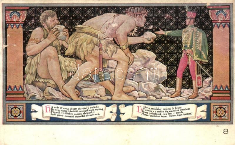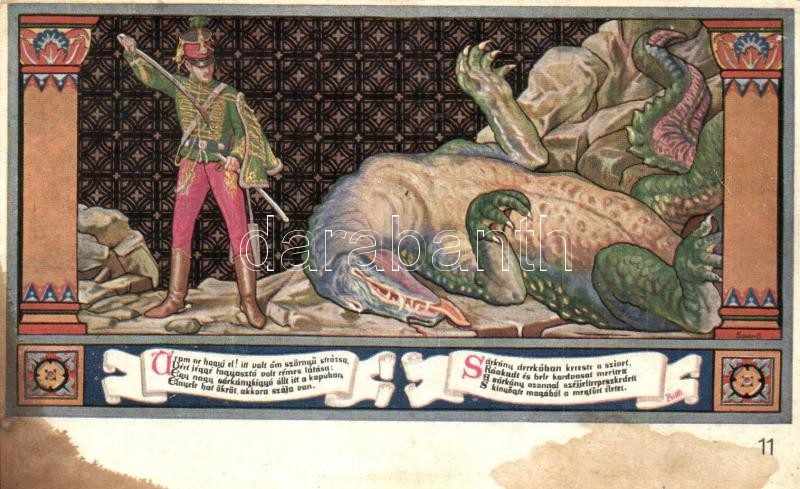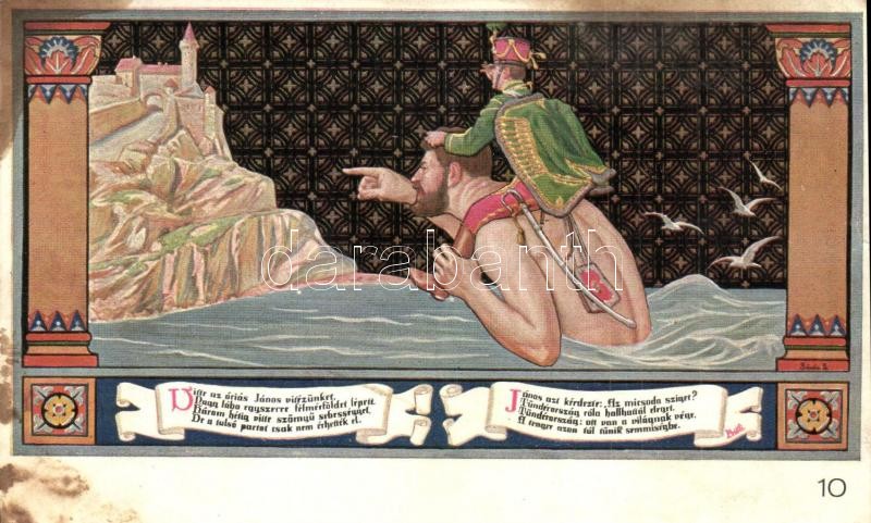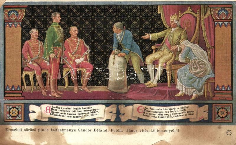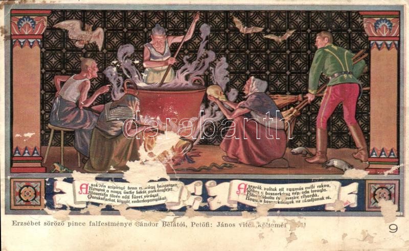 Description: Budapest V. Egyetem utca 5. Erzsébet Királyné Szálló étterem és söröző pince, Sándor Béla falfestménye Petőfi Sándor János vitézéből - 5 db régi képeslap, vegyes minőségben / art postcard series with 5 postcards, mixed quality