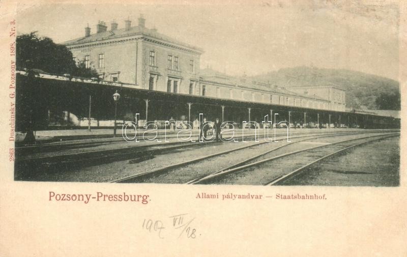 1907 Pozsony, Pressburg, Bratislava; Állami pályaudvar, Vasútállomás. Kiadja Duschinsky G. 1898. Nr. 3. / Staatsbahnhof / railway station (r)