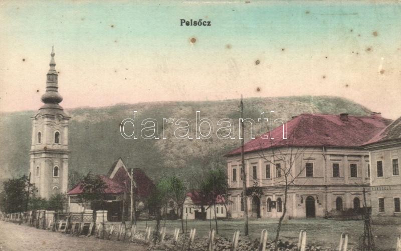 Pelsőc, Pelsücz, Plesivec; utca, templom, városház / street, church, t...