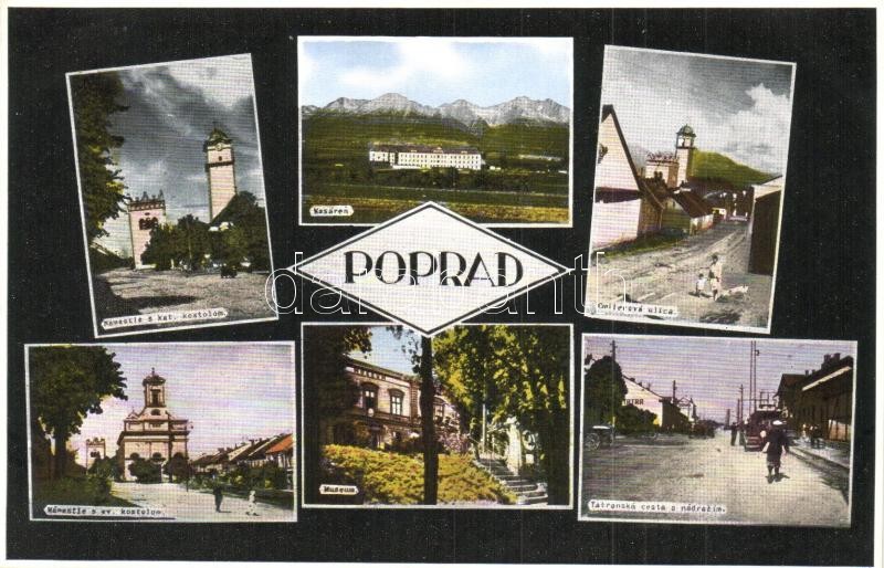 Poprád (Tátra, Tatry); Námestie s kat. kostolom, Kasáren, Cmilerová ulica, Námestie s ev. kostolom, Museum, Tatranská cesta s nadrazim / Katolikus templom, laktanya, utcakép, Evangélikus templom, Múzeum, Vasútállomás / Catholic church, military barracks, street view, Lutheran church, museum, railway station