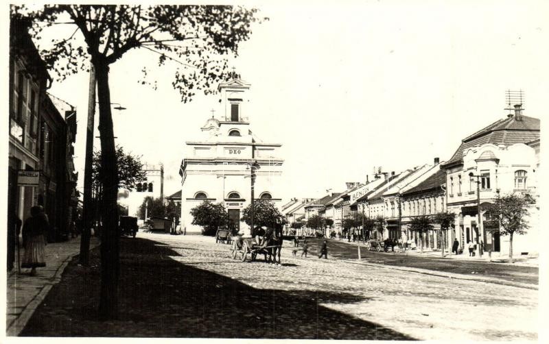 Description: Poprád (Tátra, Tatry); utcakép, Evangélikus templom, benzintöltő állomás, üzletek / street view, Lutheran church, gas station, shops. Alex Bresel photo