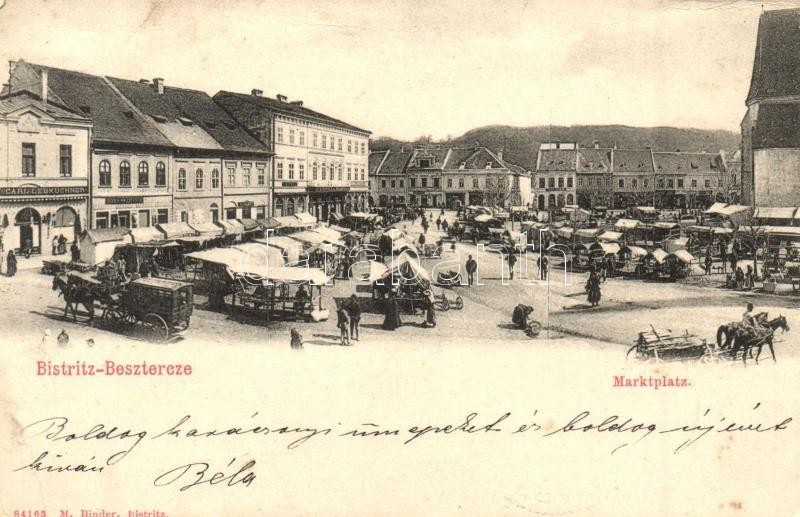 1904 Beszterce, Bistritz, Bistrita; Marktplatz / Piac tér, Carl Lebkuchner, Johann Lutsch, Geckner üzlete, piaci árusok, bódék. Kiadja M. Binder / market square, shops, vendors, booths (EK)