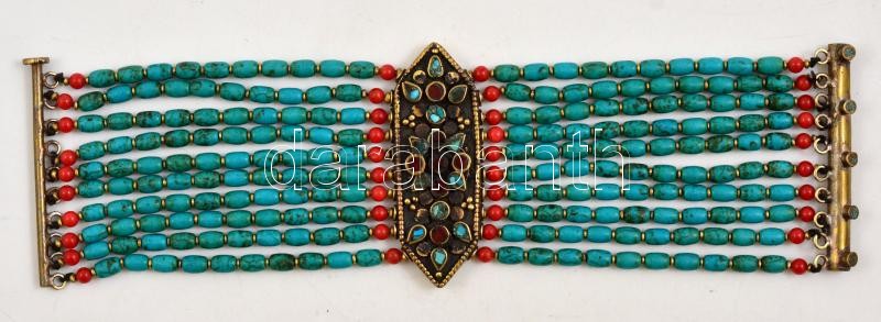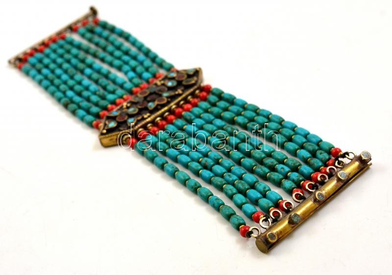 Nepáli, 10 soros türkiz és korall karkötő hatszögű középrészen plaszti...