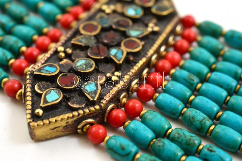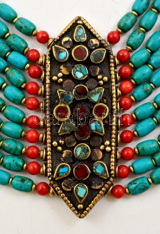 Nepáli, 10 soros türkiz és korall karkötő hatszögű középrészen plasztikus kőberakással