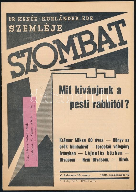 https://www.darabanth.com/en/334-Online-auction/334.0/Art-and-other-collectibles/Judaica~25/1932-A-Szombat-Dr-Kenez-Kurlander-Ede-szemleje-V-evfolyamanak-18-szama-Bereny-Robert-cC3~II1876601