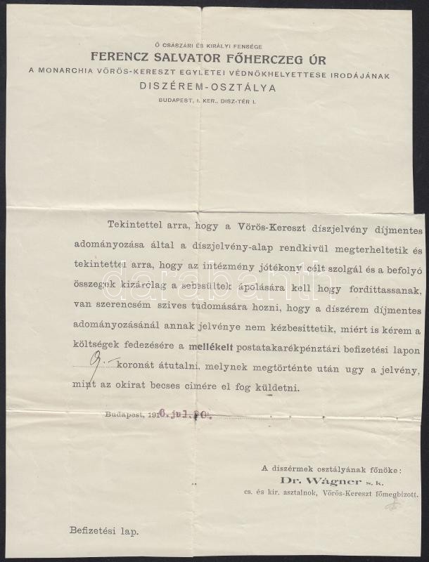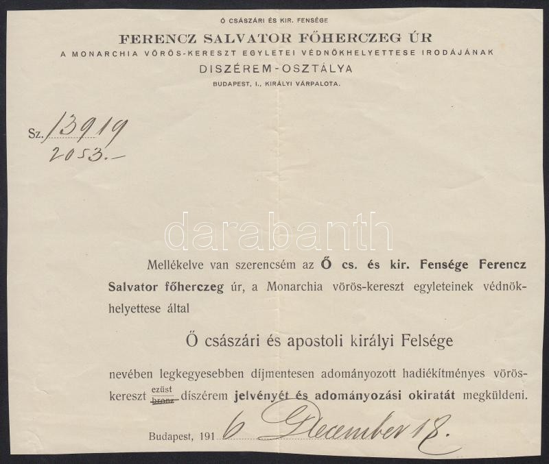 1916 Ferenc Salvator Főherceg Úr a Monarchia Vörös-kereszt Egyletei Vé... https://www.darabanth.com/en/334-Online-auction/334.0/Art-and-other-collectibles/Military~29/1916-Ferenc-Salvator-Foherceg-Ur-a-Monarchia-Voros-kereszt-Egyletei-Vednokhelyettese-Irodaja~II1871961