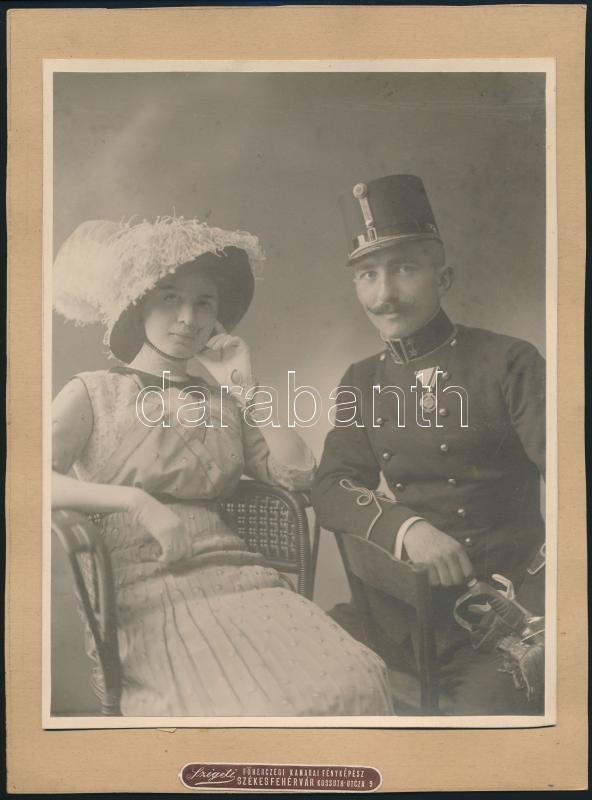 cca 1910 László Béla osztrák-magyar tizedes, műtermi fotója jegyesével, Szigeti fényképész Fehérvár műterméből, kartonra kasírozva, 20x15,5 cm