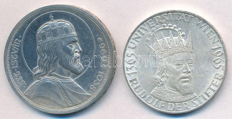 Vegyes: 1938. 5P Ag "Szent István" + Ausztria 1965. 50Sch Ag "600 éves...
