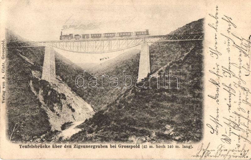 Description: 1909 Nagyapold, Grosspold, Apoldu de Sus; Teufelsbrücke über den Zigeunergraben / Ördög vasúti híd a Cigány-árok felett, gőzmozdony, viadukt. Kiadja A. Glatz / railway bridge, viaduct, locomotive (EK)