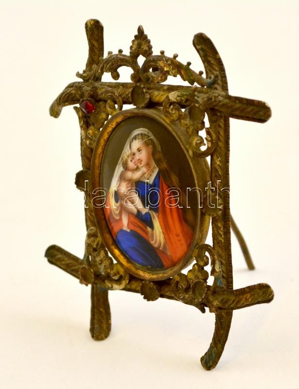 Madonna porcelán, kép kézzel festett. Réz asztali keretben. 9 cm