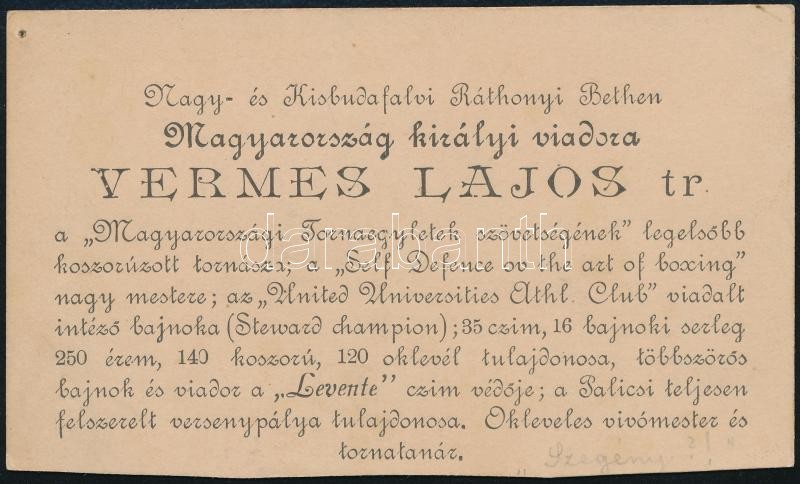 1895 Vermes Lajos (1860-1945): neves sportoló, sportszervező, vívómester és tornatanár névjegykártyája, a hátoldalán saját kezű soraival, aláírásával
