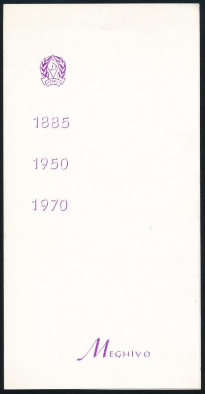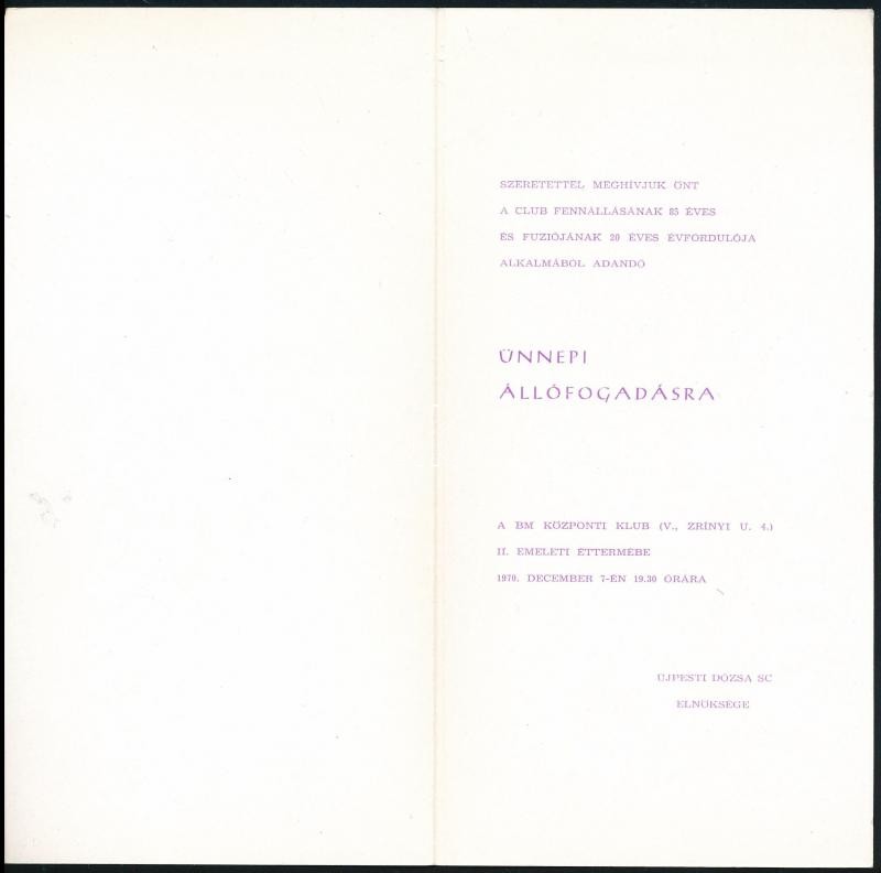 1970 Újpesti Dózsa SC (Újpesti FC) ünnepi meghívója a klub fennállásának 85 éves és fuziójának 20 évfordulója alkalmából tartandó ünnepi állófogadásra, Bp., BM Központi Klub, 1970. dec. 7.