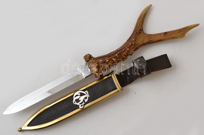 Csigi János dísztőr, őzagancs nyéllel, dísztokban, réz-bőr tokban rajta monogrammal, h:31 cm