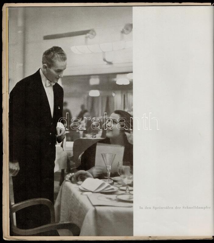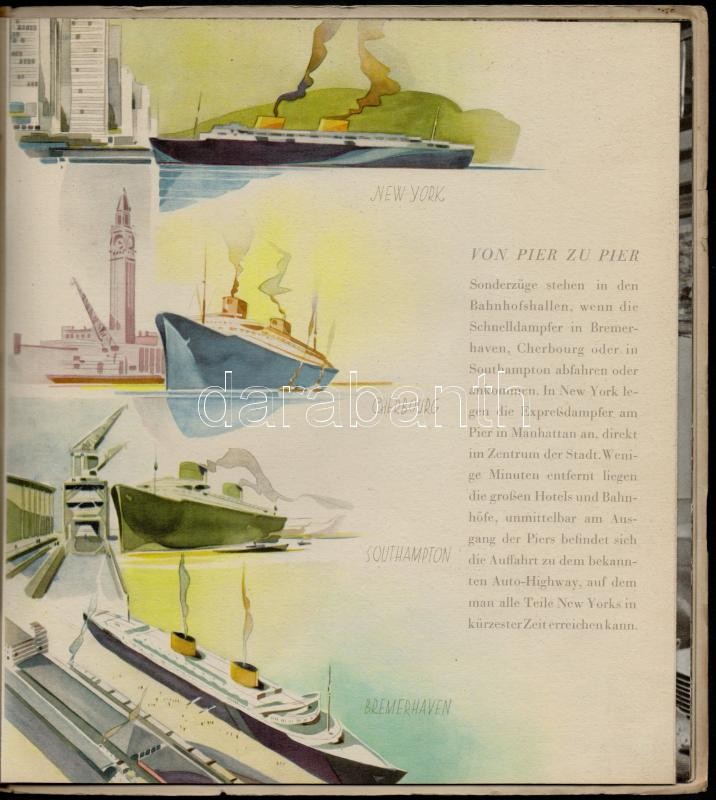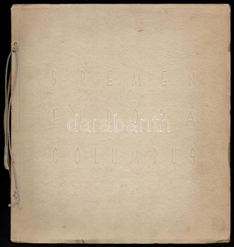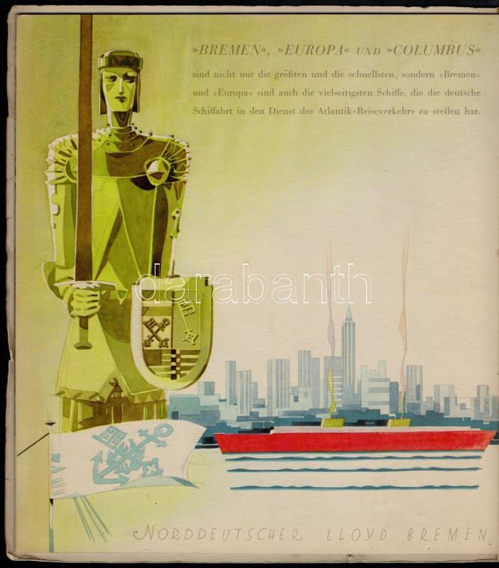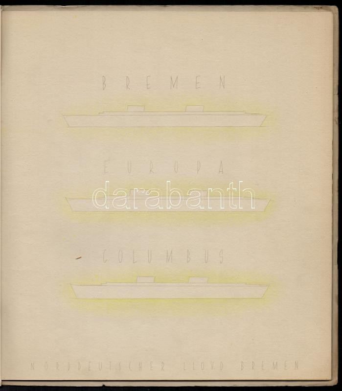 cca 1930 Bremen, Europa, Columbus. Norddeutscher Lloyd, Bremen német hajózási vállalat prospektusa, számos fekete-fehér fotóval, színes illusztrációval, német nyelven. A borító szakadt./ cca 1930 Bremen, Europa, Columbus. Brochure of Norddeutscher Lloyd, Bremen German shipping company. With black-and-white photographs and colorful illustrations, in German language. The cover damaged.