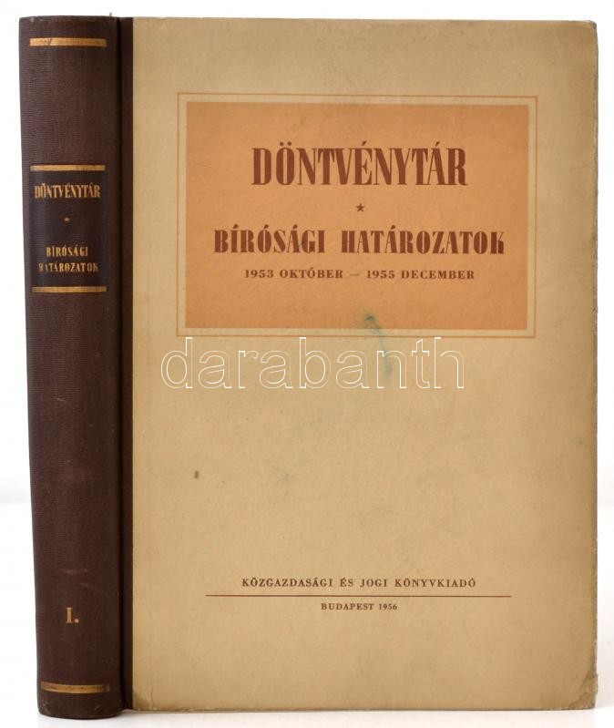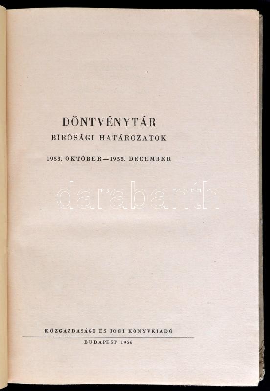 Döntvénytár. Bírósági határozatok. 1953. október-1955. december. Bp.,1956, Közgazdasági és Jogi Könyvkiadó. Szerk.: Benkő Gyula,Jeszenszky Ferenc, Géczy Kálmán, Simor Pál, Szepes Gyula. Kiadói félvászon-kötés, kissé kopott, kissé foltos borítóval.