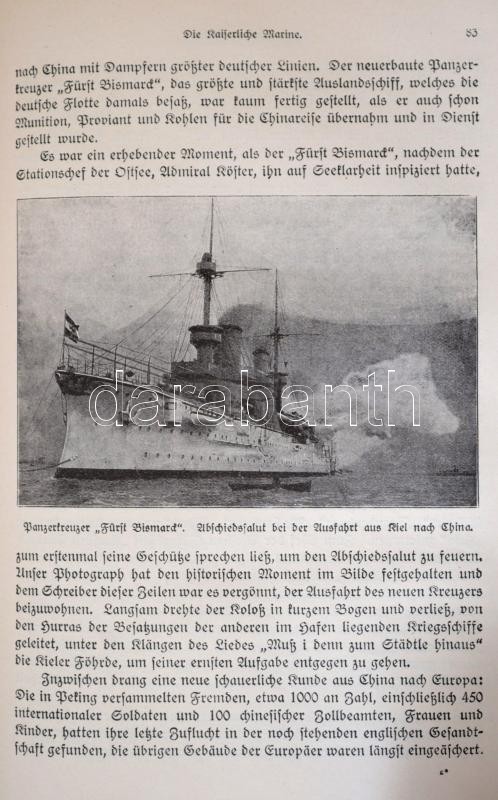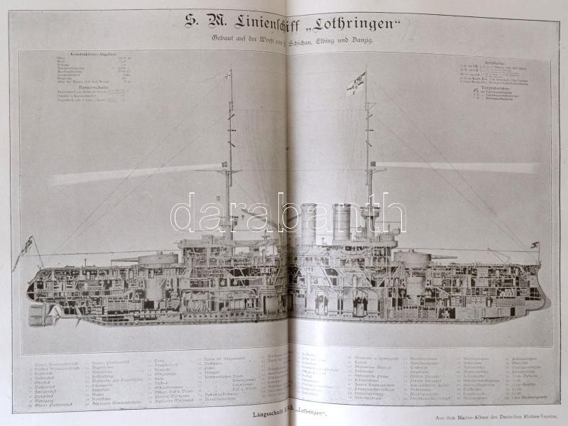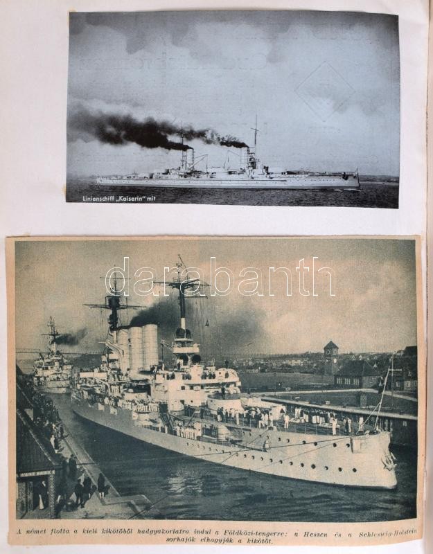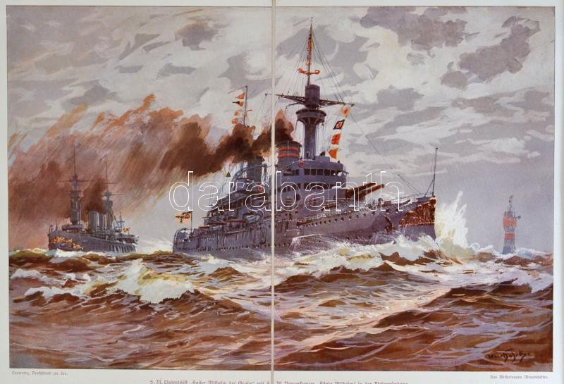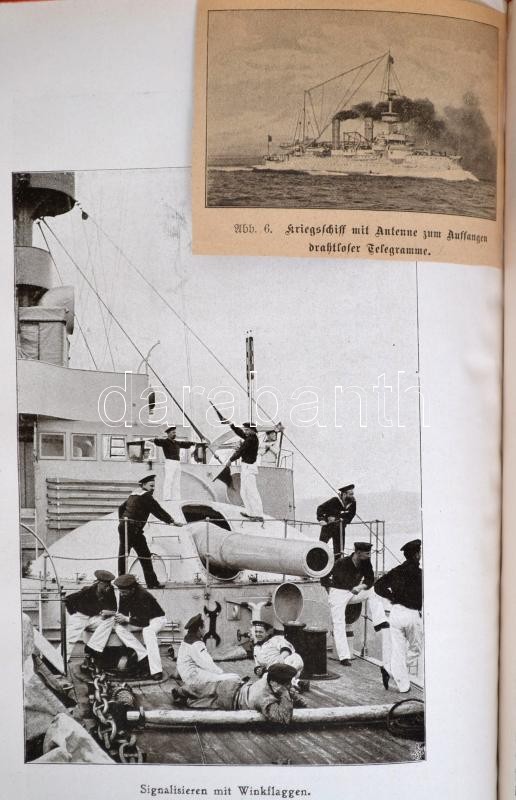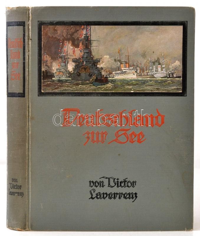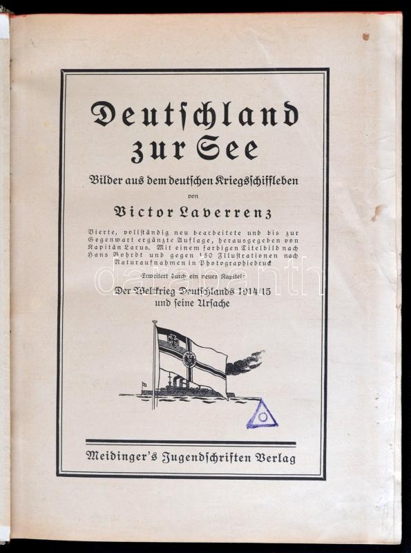Victor Laverrenz: Deutschland zur See. Bilder aus dem deutschen Kriegsschiffleben. Berlin,é.n.,Meidinger's Jugendschriften Verlag. Negyedik, teljesen átdolgozott. Gazdag fekete-fehér képanyaggal illusztrált. Magyar nyelvű újságokból a könyv témájába vágó fotókat ragasztottak. Kiadói egészvászon-kötés, kopott borítóval, javított gerinccel./ Linen-binding, worn cover, with repaired spine, with black-and-white photographs, in German language. With extra black-and-white photographs, from Hungarian newspapers.