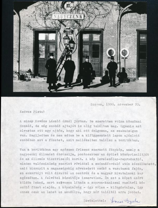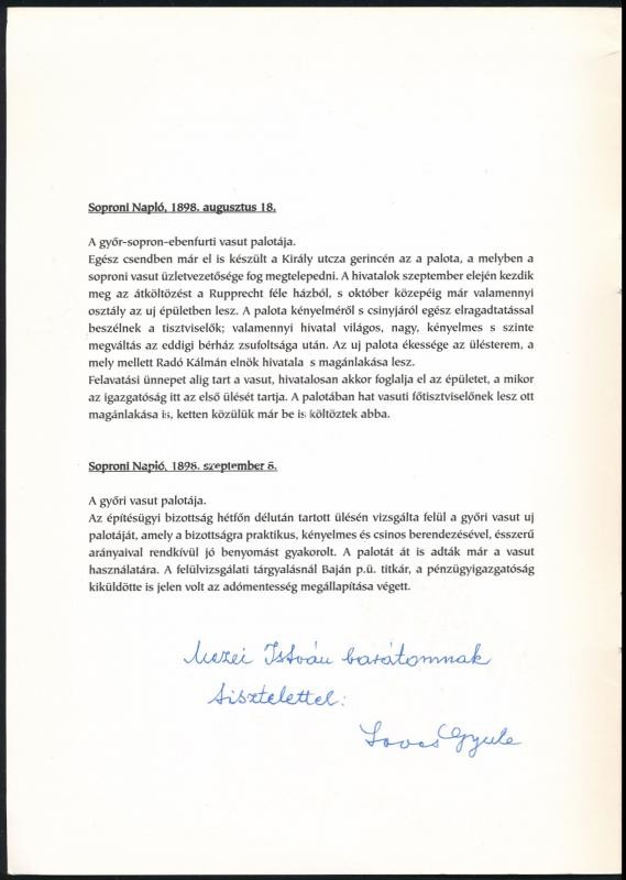 Lovas Gyula: A Győr-Sopron-Ebenfurti Vasút Igazgatósági Épületének Centenáriumára. 1898. Bp., 1998, GySEB Rt.-ny., 10 p. Kiadói papírkötés.+A nagycenki állomás fotójával. A szerző, Lovas Gyula (1925-2014) vasúttörténész által Mezei István (?-2015) gépészmérnök, MÁV főtanácsos, vasúti szakíró, vasúttörténész részére dedikált példány. Valamint a szerző gépelt levélével, aláírásával Mezei István részére.