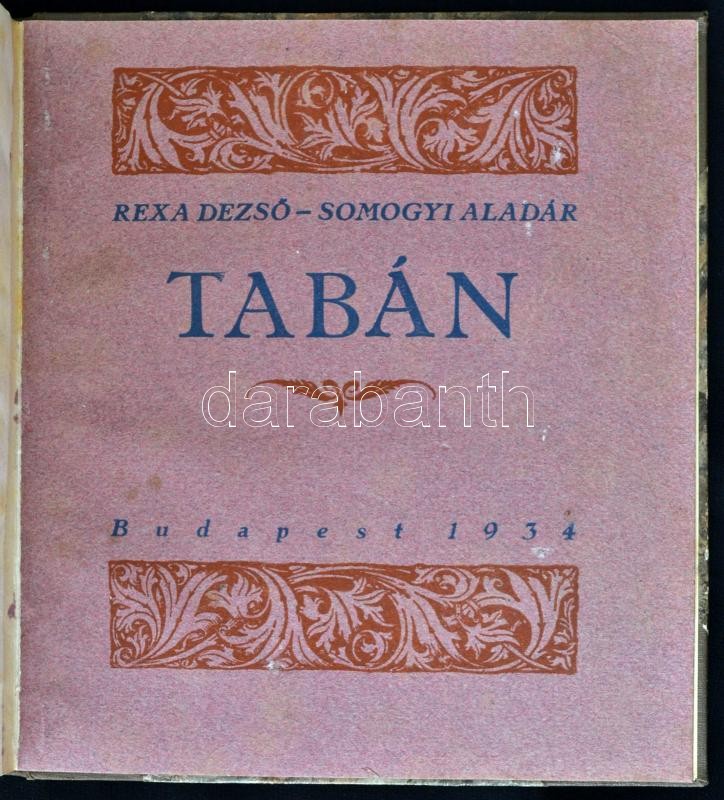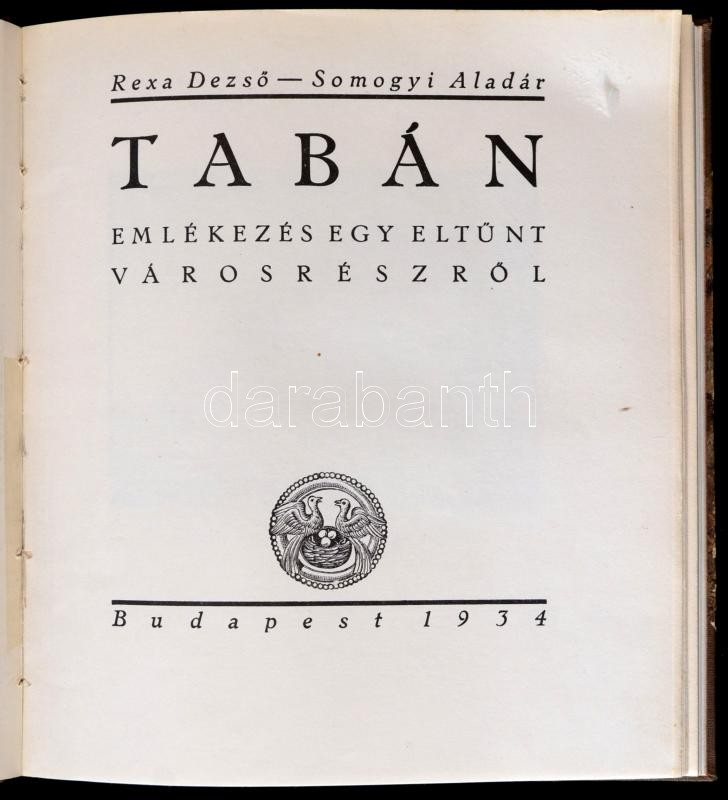Rexa Dezső-Somogyi Aladár: Tabán. Emlékezés egy eltűnt városrészről. Bp., 1934, Kir. M. Egyetemi Nyomda, 113+4 p.+ 4t. (1 színes, 3 kihajtható)+ 1 kihajtható térkép. Átkötött modern félvászon-kötés, kissé kopottas borítóval, az átkötéskor az eredeti papírborítót is bekötötték, a könyv végében található, egy két kissé foltos lappal. Az egyik szerző, Rexa Dezső (1872-1964) irodalomtörténész, levéltáros, helytörténész, nyelvész által Bilkei Gorzó Nándor (1890-1969) művészettörténész, levéltáros, politikus részére dedikált példány. Bilkei Gorzó Nándor ex libris-szével.