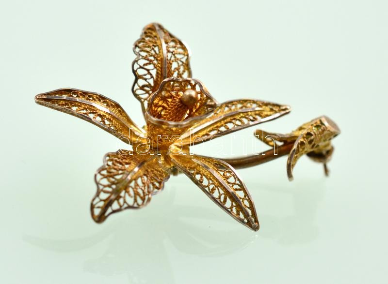Aranyozott ezüst(Ag) filigrán virágos bross, jelzett, 2,5×4 cm, nettó:...