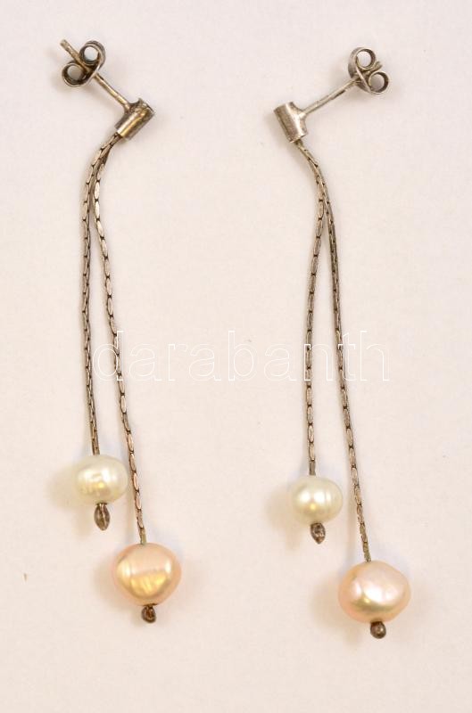 Ezüst(Ag) fülbevalópár, tenyésztett gyöngyökkel, jelzett, h: 6 cm, bruttó: 3,3 g