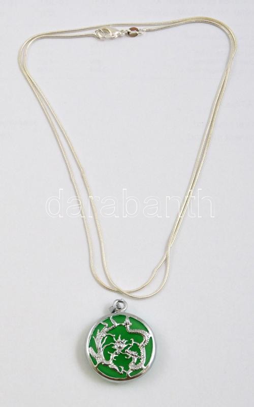 Ezüst(Ag) kígyó nyaklánc, jelzett, h: 66 cm, nettó: 6 g + szintetikus jáde medál fém foglalatban, d: 2,5 cm