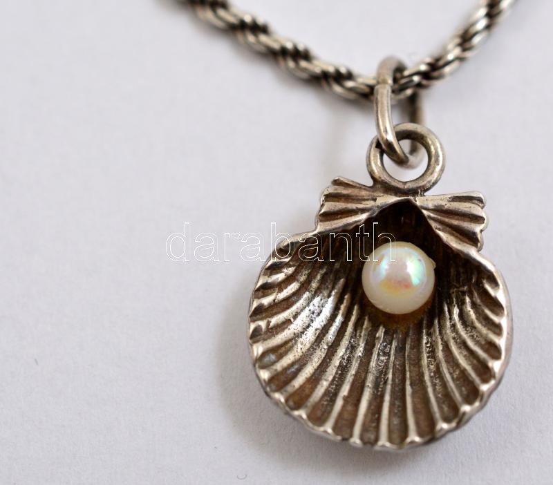 Ezüst(Ag) vékony walles nyaklánc, gyönggyel díszített kagylós medállal, jelzett, h: 45 cm, 2,3×1,5 cm, bruttó: 7,4 g