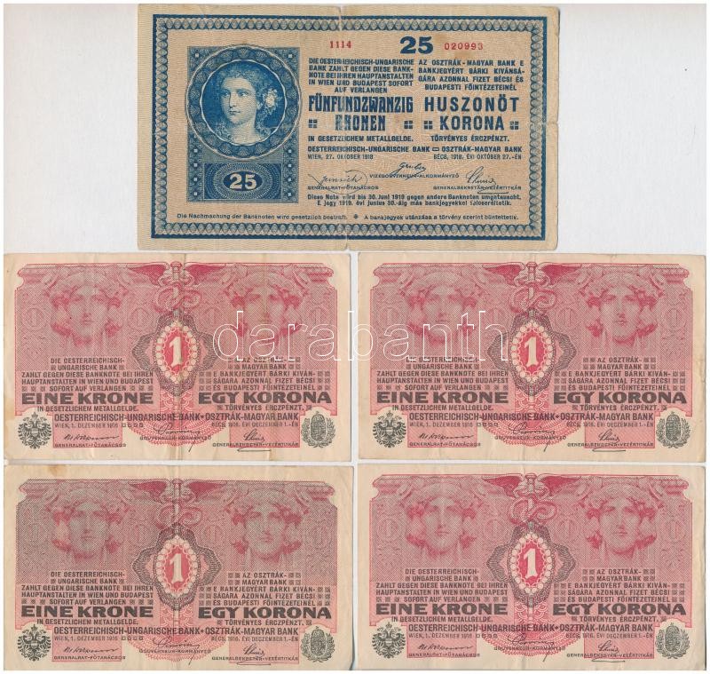 1916. 1K (4x) közte sorszámkövető pár és egy közeli sorszám + 1918. 25K "1114" 3mm-es sorszám, hullámos hátlap T:III,III-