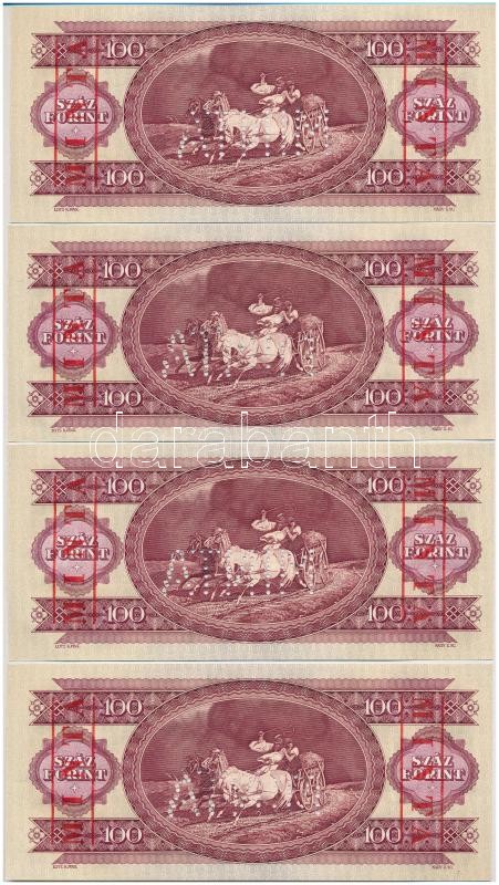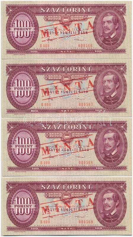 1984. 100Ft piros "MINTA" felülnyomással és perforációval (4x), sorszámkövetők "B000 000566 - B000 000569 sorszámmal T:I Hungary 1984. 100 Forint with "MINTA(SPECIMEN)" overprint and perforation (4x), sequential serials "B000 000566 - B001 000569" serial numbers C:UNC