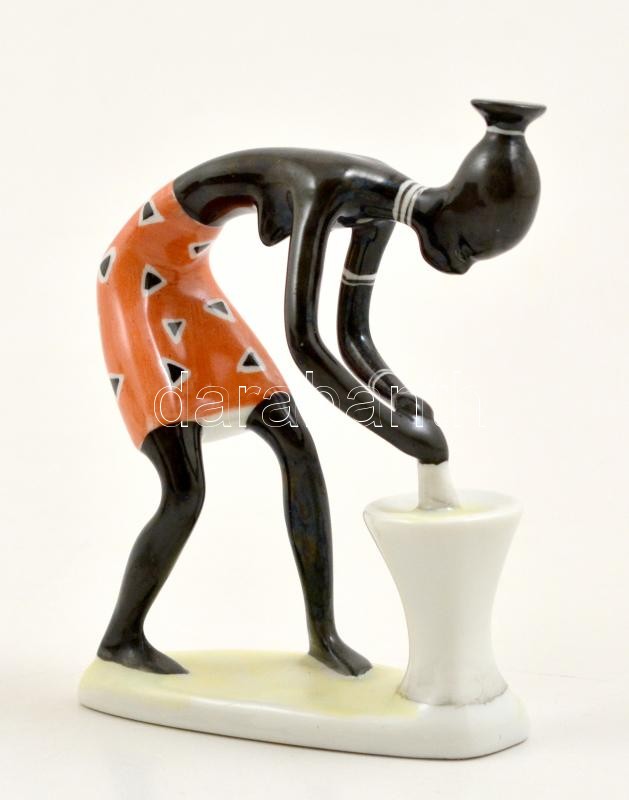 Hollóházi afrikai nő, kézzel festett, jelzett, kis kopásokkal, m: 11,5 cm
