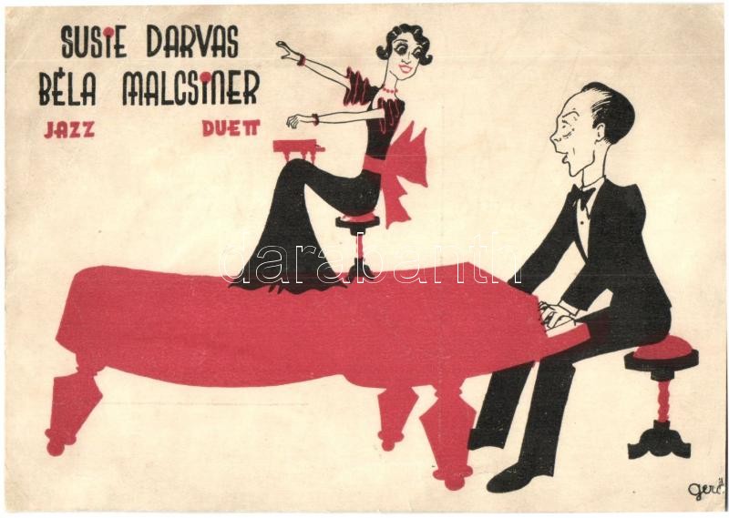 Malcsiner Béla és Darvas Susie jazz duettjét népszerűsítő művészlap / Susie Darvas & Béla Malcsiner jazz duet's art advertisement card. s: Gerő (r)