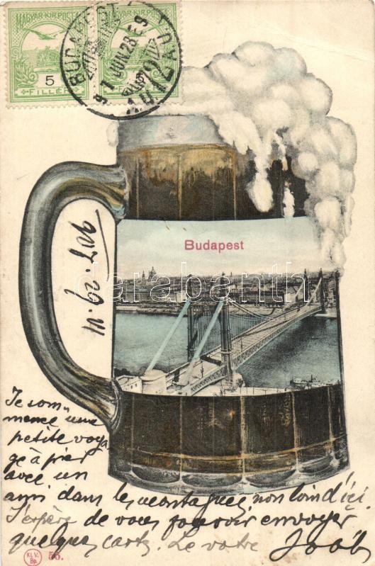 Budapest, Erzsébet híd. Montázslap söröskorsóval / Montage postcard wi...