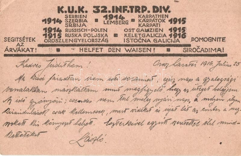1916 K.u.K. 32. Inf. Trp. Div. Feldpostkarte / A 32. gyaloghadosztály ... https://www.darabanth.com/en/335-Online-auction/335.0/Postcards/Militaria~2000059/1916-KuK-32-Inf-Trp-Div-Feldpostkarte-A-32-gyaloghadosztaly-haborus-tortenete-OsztrC3~II1879611