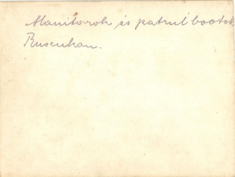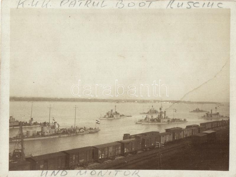 Description: Osztrák-magyar monitorok és őrnaszádok a Dunán Rusze-nál; Dunaflottilla / K.u.K. Kriegsmarine Donauflottille / WWI Austro-Hungarian Navy Danube Fleet patrol and river guard ships by Ruse (Bulgaria), wagons. photo (non PC)
