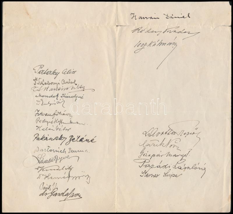 Description: cca 1930 A Magyar Nemzeti Múzeum Könyvtára (a későbbi Országos Széchenyi Könyvtár) 23 munkatársának aláírása levéltöredéken: Sikabonyi Antal, Bartoniek Emma, László Gyula, Pukánszky Béláné Kádár Jolán, Isoz Kálmán, stb.