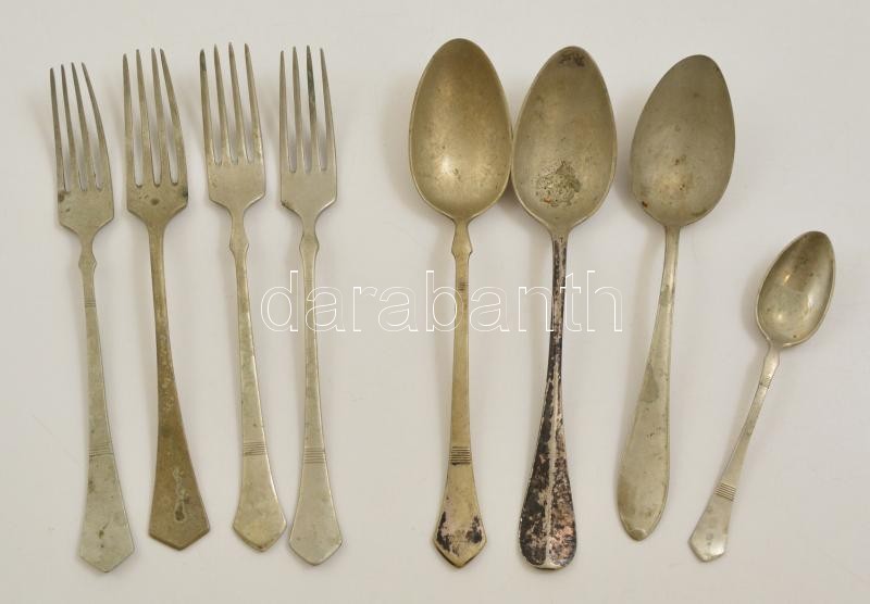 8 db alpakka evőeszköz: kanalak, villák, kiskanál, h: 14-22 cm