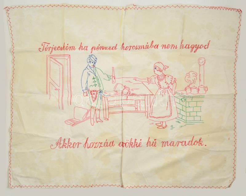"Férjecském, ha pénzedet korcsmába nem hagyod, hozzád én örökre hű maradok." hímzett konyhai falvédő 102x75 cm
