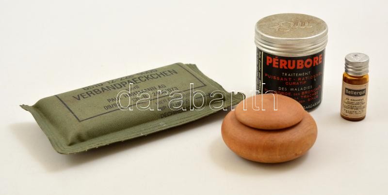 Régi gyógyszerdoboz és Sandoz üveg, fa mini dobozka, kötözőszer