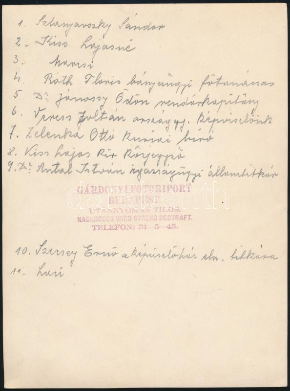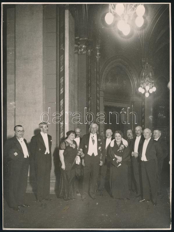 cca 1930 Budapest, Országház, felsőházi tagok csoportképe, köztük Dr. Jánossy Ödön rendőrkapitány, Róth Flóris bányaügyi főtanácsos, Dr. Antal István igazságügyi államtitkár, Gárdonyi fotoriport felvétele, hátoldalán feliratozott, 23,5x17,5 cm